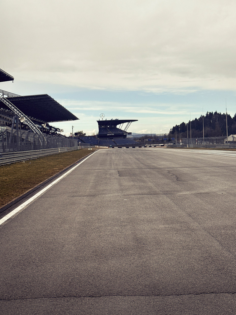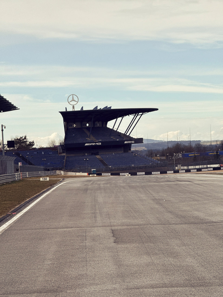 Nach dem Pitwalk sind wir dann vorne Boxenausfahrt ins Grid. Also dieses Mal ganz nach vorne statt wie meistens, ganz nach hinten bis in die letzte Kurve bzw. sogar Schikane rein. Von dort hatten wir eine neue Perspektive: der direkte Blick auf die AMG-Arena von der Start-Ziel hat auch was. Und es war extrem interessant, die Autos aus der Boxenausfahrt bei der Fahrt ins Grid zu beobachten. Ich hatte schon das 28-70 aufgeschnallt, weil ich die Idee hatte, dass das im Grid die beste Wahl wäre. Was sie auch ist, aber für die herausfahrenden Autos wäre das 70-200 sicher besser gewesen. Egal, Nico hatte ein Zoom mit längerer Brennweite drauf und wir „arbeiten“ ja immer als Team und haben dann schön verschiedene Fotos.