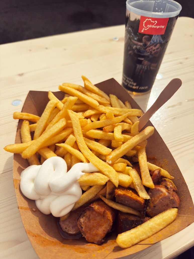 Den Start haben wir uns dann von der T12 aus angeschaut, bzw. nicht den Start, sondern die erste Runde, logisch. Vom Platz her etwas uninspiriert, aber trotzdem geil. Hier sind wir noch eine Weile geblieben und sind dann zurück zum Auto, um zum Brünnchen zu fahren. Aber natürlich nicht, ohne vorher noch die obligatorische Currywurst-Fritten-Majo zu futtern, diesmal wieder im Fahrerlager.