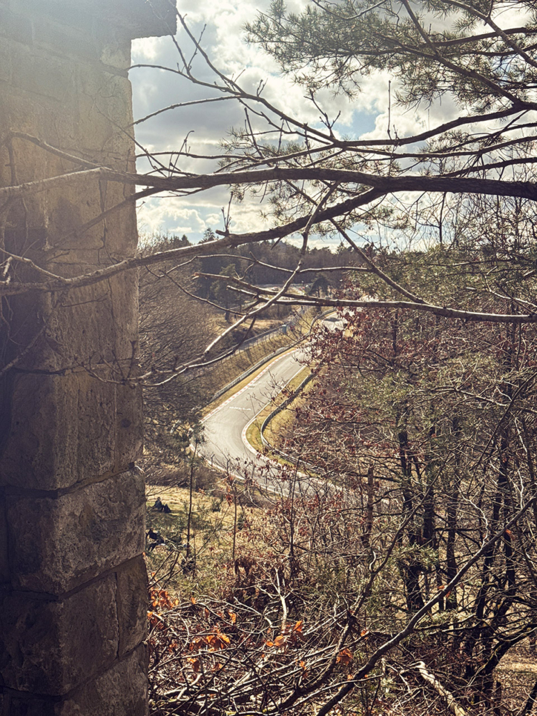 Auf, ich würde sagen, halben Weg die Steilstrecke runter gibt es links etwas versteckt im Wald ein altes Häuschen, ich weiß gar nicht mehr, was das ist oder war. Von hier hat man einen traumhaften Blick auf die Anfahrt zum und das Caracciola-Karussell. Wer möchte/kann, kann da auch auf’s Dach klettern, was eine noch etwas bessere Perspektive bietet. Für mich ist so etwas natürlich gleich aus mehreren Gründen ausgeschlossen.